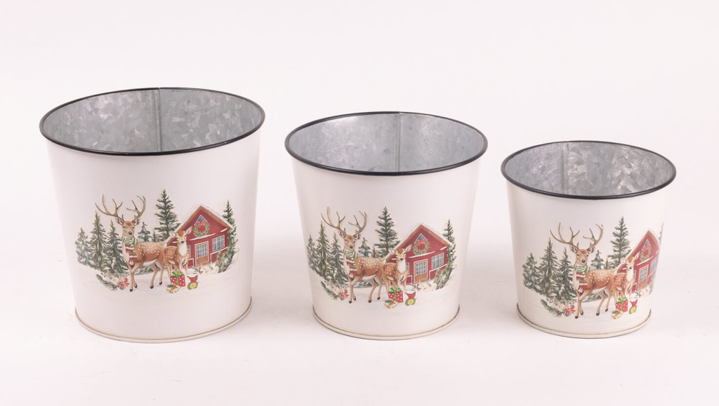 Téli házikós bádog kaspó szett - Fehér 12-16 cm (3 részes)